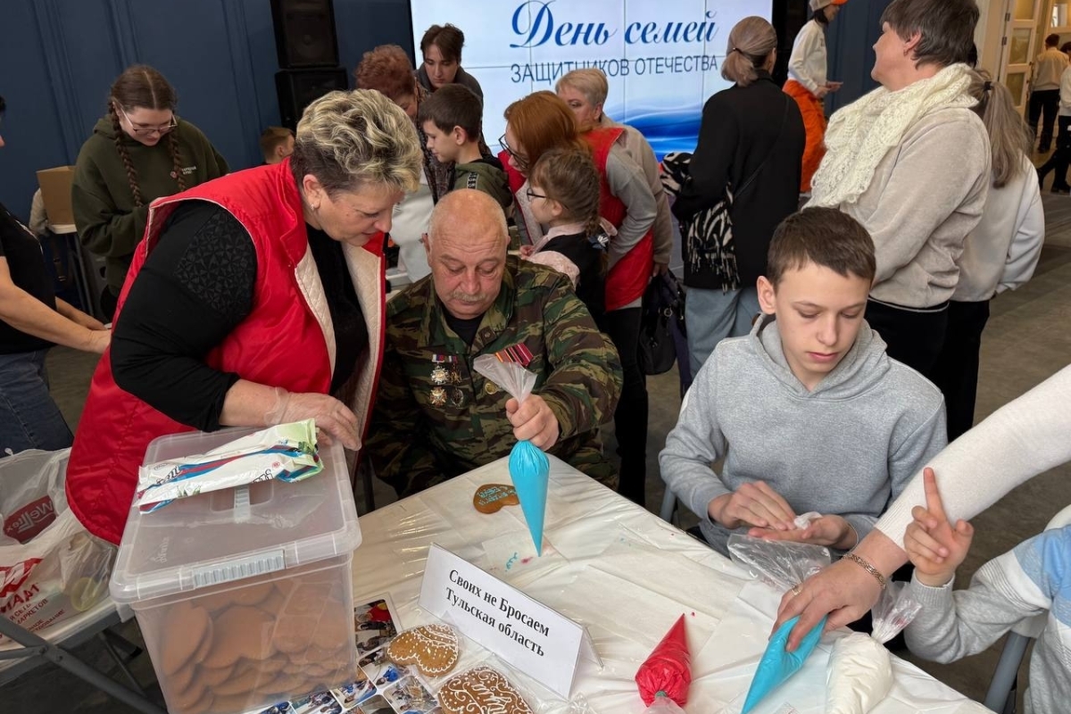 Педагоги провели мастер-класс по росписи имбирных пряников, которые выпекли специально к 23 февраля для отправки бойцам в зону СВО. Участвующие в празднике жены, дети, родители, сестры и братья бойцов расписывали пряники для своих родных защитников. Душевные и по-семейному теплые надписи оставили они на пряниках, которые совсем скоро отправятся на фронт: «Папе от Полины», «Я жду тебя, сынок», «Кедр, Ангел храни тебя», «Всё для Победы71».