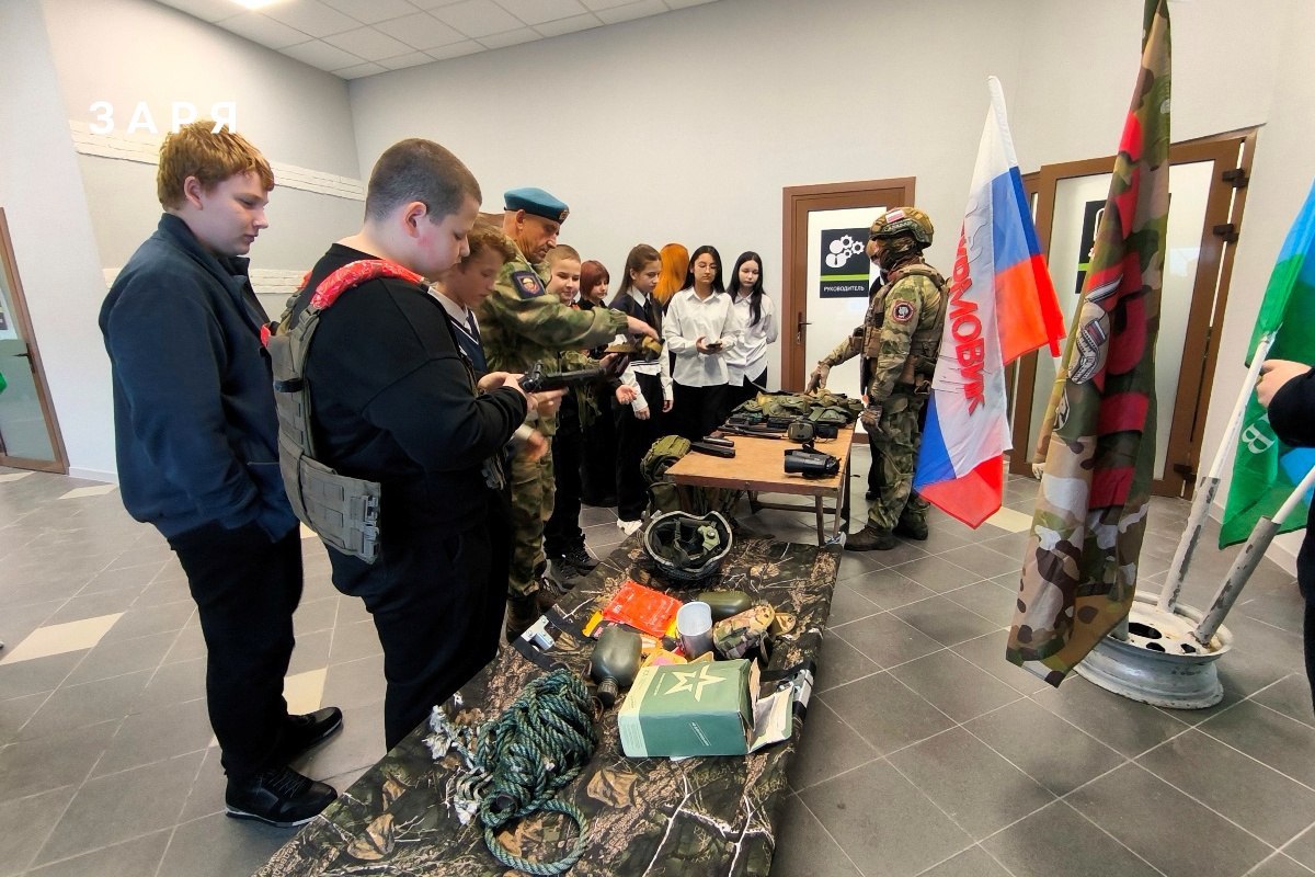 Затем школьники познакомились с выставкой обмундирования и некоторых предметов вооружения и быта воинов, которую для них подготовили участники спецоперации, показав все то, чем они пользовались там, на линии боевого соприкосновения.