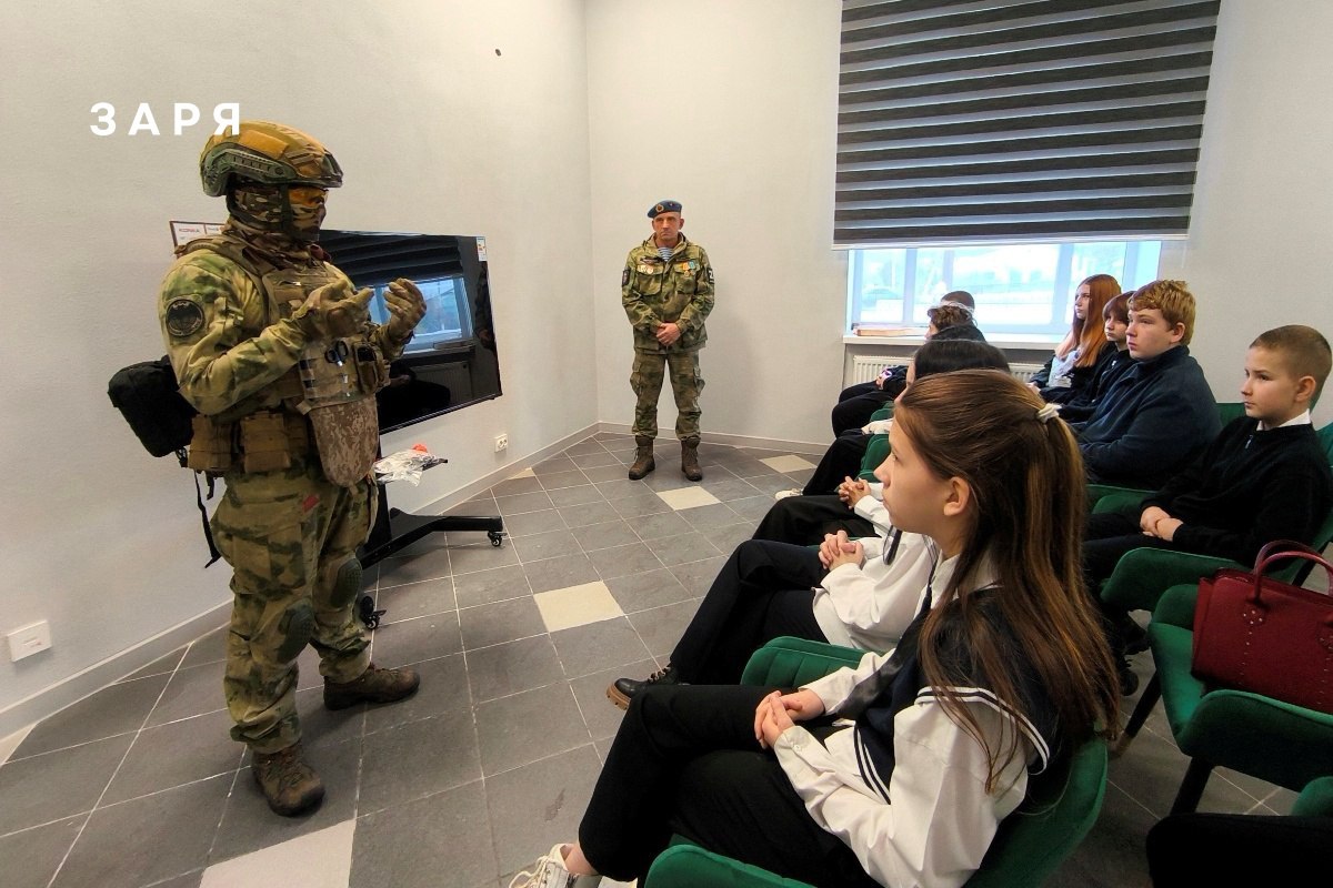 Михаил с позывным «Погран» подробно рассказал школьникам об экипировке, объясняя, для чего предназначена та или иная ее деталь, о некоторых случаях своей работы на СВО. К общению со школьниками присоединился и Василий Троненко. Они ответили на вопросы школьников.